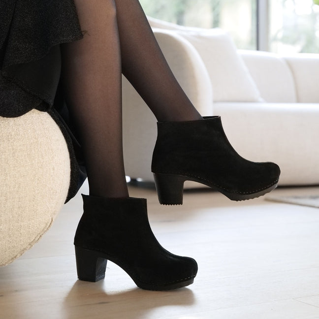 Tendance, notre jolie bottine en cuir noir à talon Calyssa se mariera parfaitement avec un jean ou une jupe longue. Équipée d'une semelle intérieure en mouton, cette bottine fourrée vous apportera tout son confort et tiendra vos pieds au chaud pour affronter l’hiver. La semelle bois classique apporte confort tout en gardant une allure féminine avec sa finition clous.