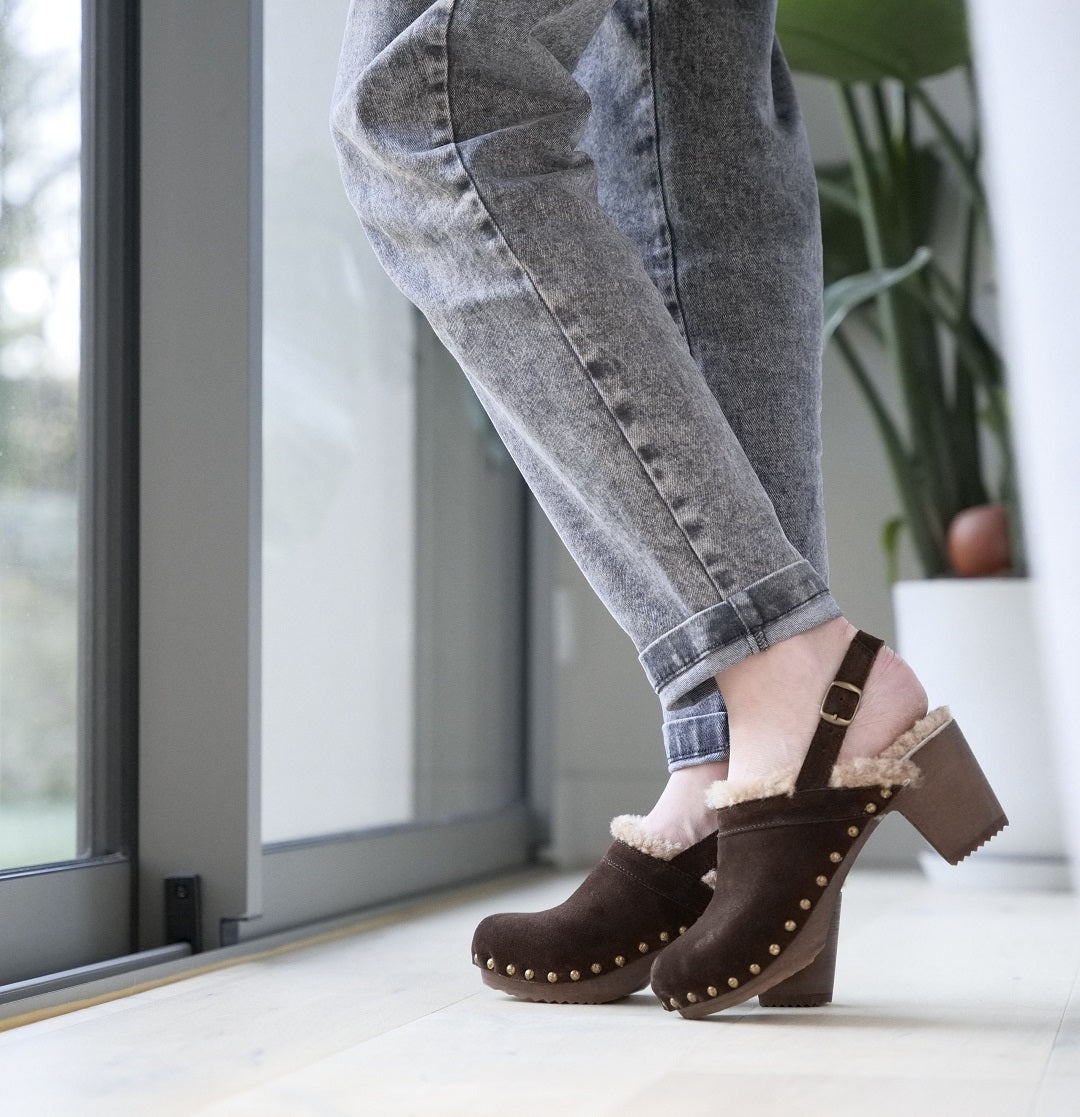 The elegant Carline fur-lined clog is a must-have for this winter. It will complement many looks and enhance your silhouette with its feminine heel, while keeping your feet warm with its wool lining. Its fixed back strap provides better foot support. The classic wooden sole provides comfort while maintaining a feminine look with its studded finish. This high version of the Swedish clog lined with sheepskin will be your best ally for spending a warm and elegant winter.