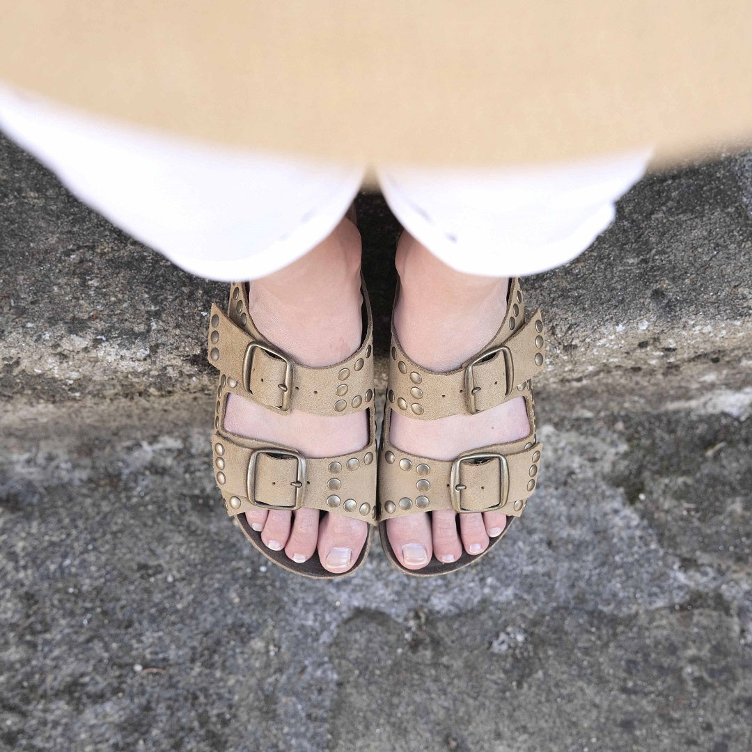 Our trendy Lisa sandals are a must-have item for this summer—soon enough, you won’t remember how you ever lived without them! Comfortable and timeless, they feature 2 adjustable straps that allow them to perfectly adapt to the shape of your feet, and their hand-embedded golden rivets add a fun and festive touch. Their cork soles are sturdy and offer excellent comfort in all circumstances.