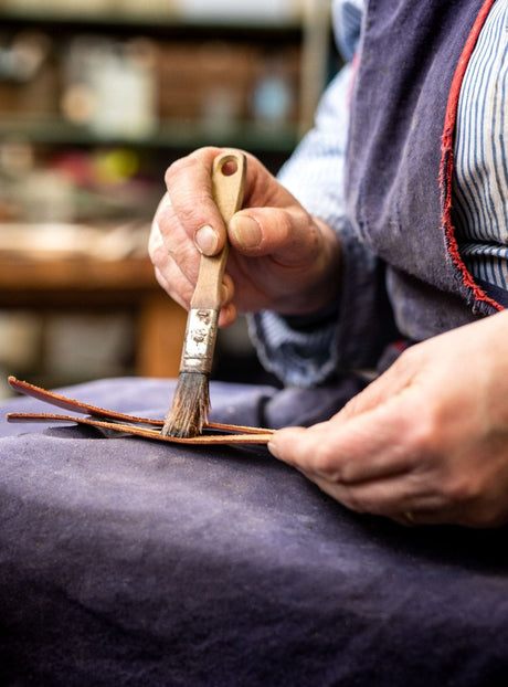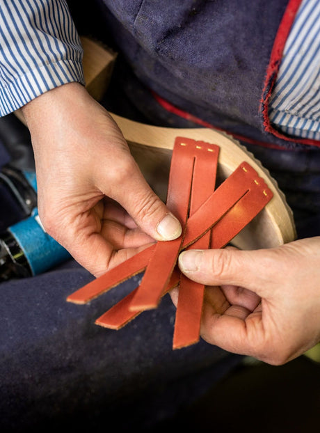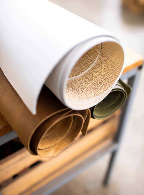 Les cuirs, de première qualité, proviennent des peausseries que nous sélectionnons avec le plus grand soin. Afin de réduire l'impact énergétique lié au transport, nous travaillons uniquement avec des tanneries françaises et européennes des pays limitrophes (Italie, Espagne). Toutes les peaux proviennent de l’industrie alimentaire en tant que sous-produit. Aucun animal n’est tué pour sa peau. La majorité de nos cuirs sont à tannage végétal, sans chrome, la peau conserve donc son aspect naturel, ce qui évite les risques d'allergie et limite l’utilisation de produits chimiques.