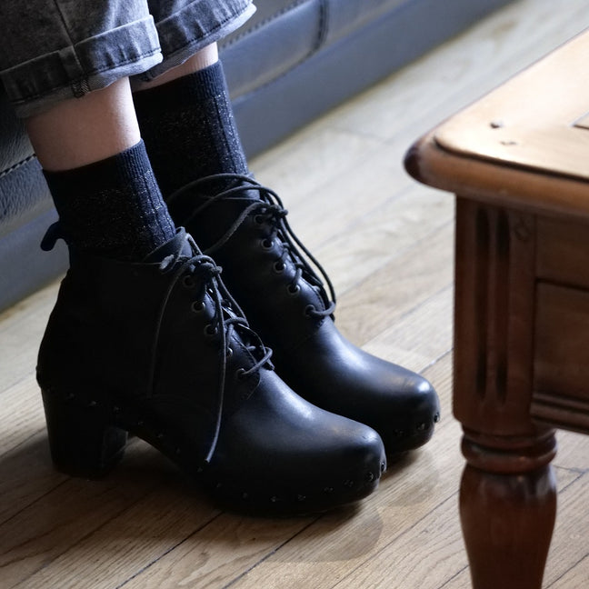 Avec une hauteur de talon de 6,5 cm, cette bottine noir vous offre l'équilibre parfait entre confort et féminité. Son travail fait main garantit une finition soignée, chaque paire étant unique.