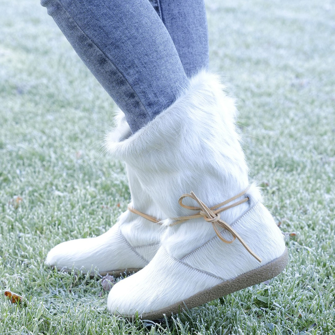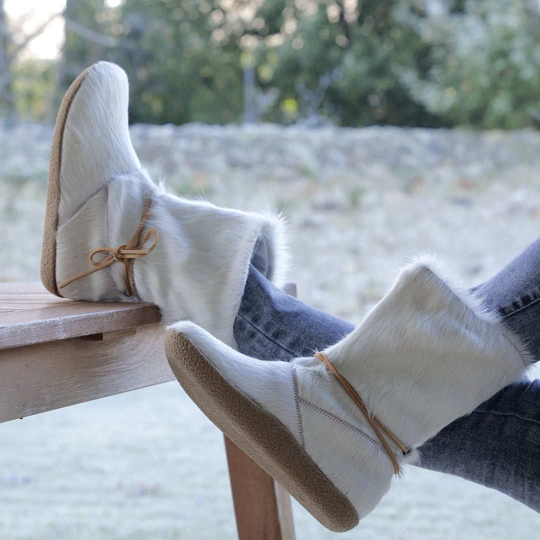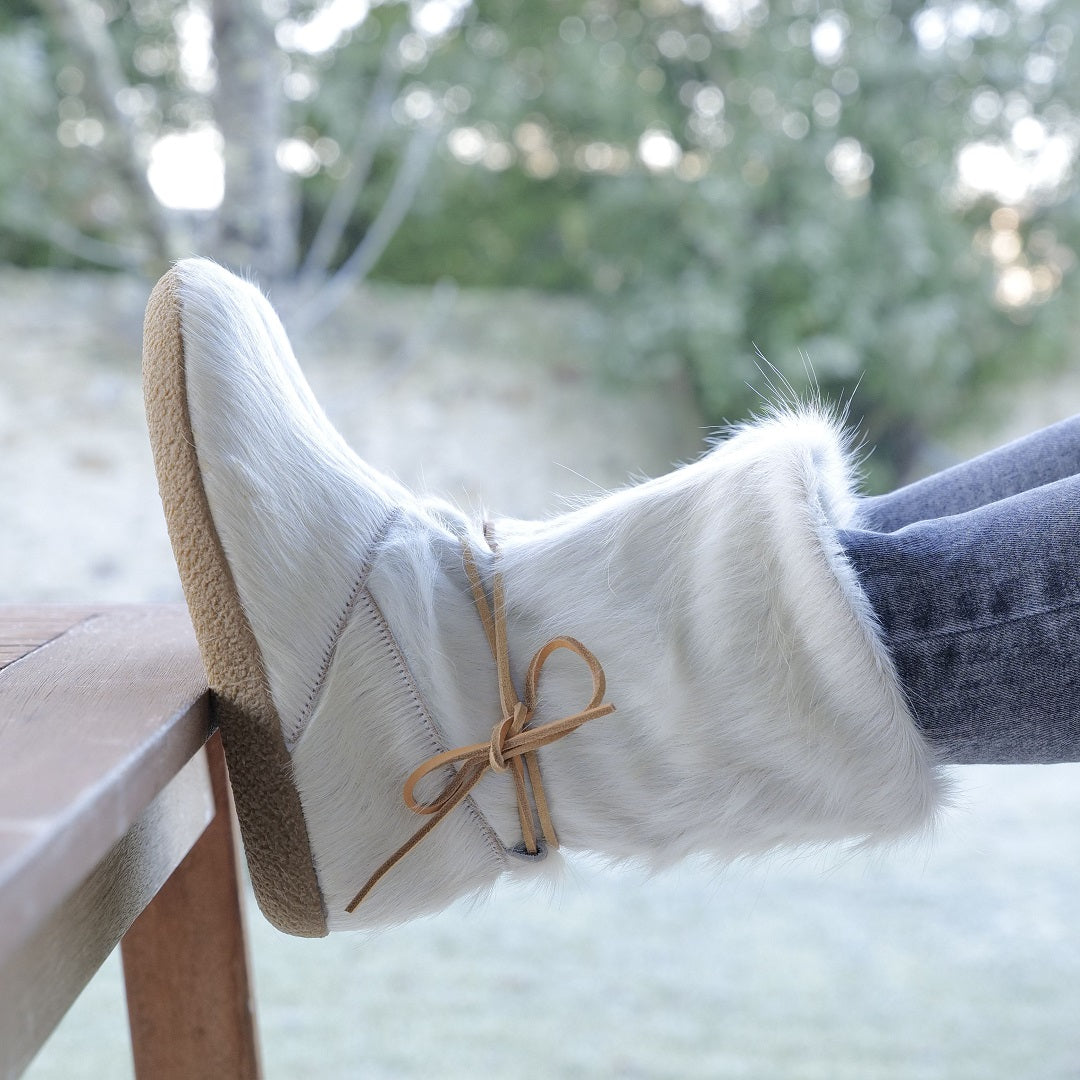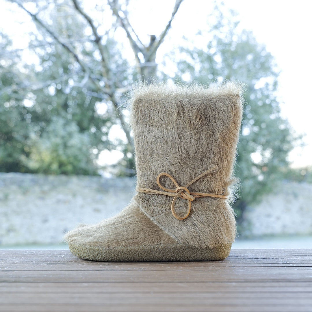 Avec sa hauteur de tige de 26 cm, la bottine Olgie protège efficacement du froid tout en allongeant la silhouette. Déclinée en poils longs coloris Cappuccino ou en poils longs blancs, elle apporte une touche naturelle et lumineuse aux tenues d’hiver, tout en restant facile à associer.