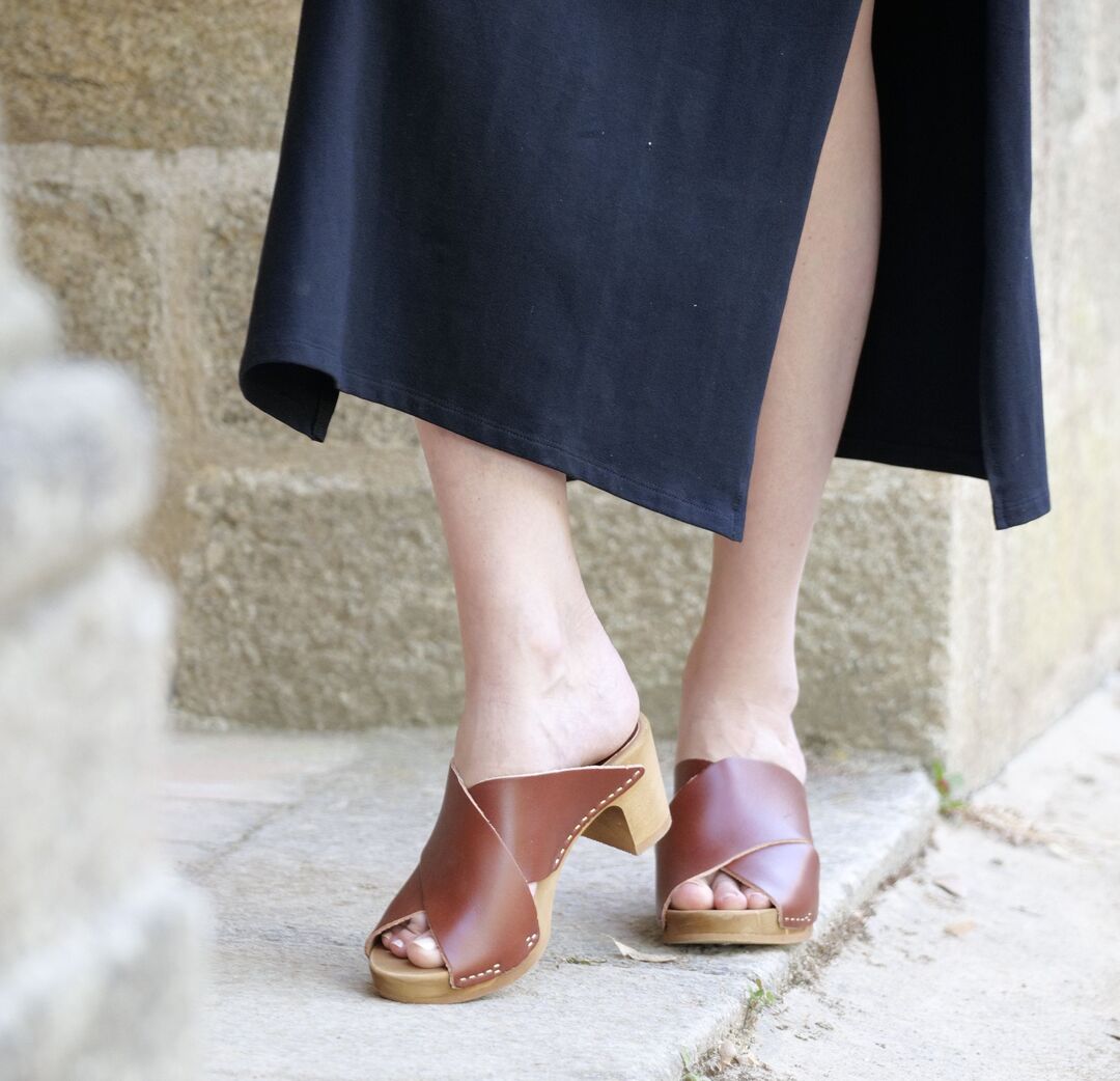 Dotée d’un petit talon élégant, de doubles brides croisées et d’une semelle en bois flexible, cette mule en cuir se veut à la fois chic et pratique. Quel que soit votre look, elle vient allonger votre silhouette avec style, sans compromis sur votre confort de marche.