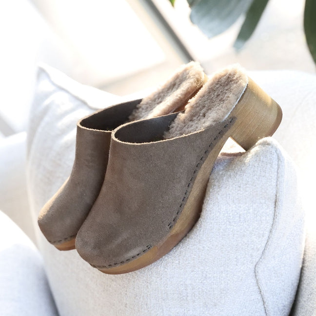 La différence avec le sabot Clémence : c’est sa délicate semelle intérieure en mouton, collé directement sur le bois, pour glisser vos pieds dans le moelleux cocon de douceur et de chaleur de ces mules fourrées ! Succombez à son charme pour cet hiver.